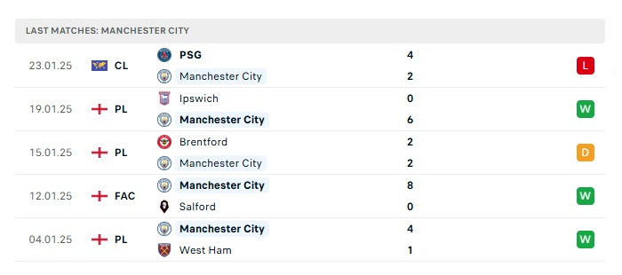• Phong độ gần đây Man City