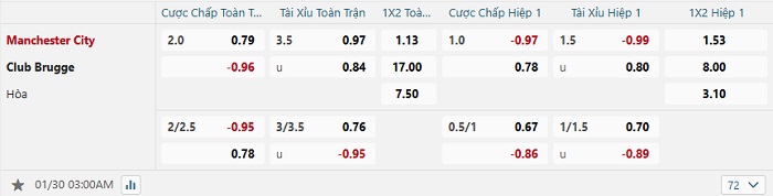 Bảng tỷ lệ kèo bóng đá Man City vs Club Brugge