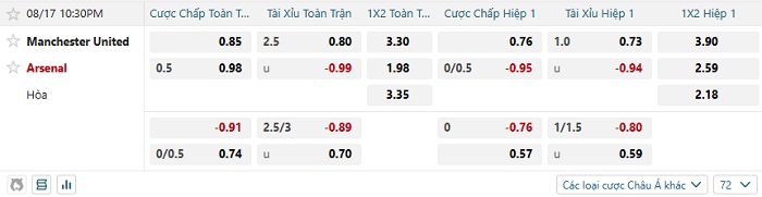 Bảng tỷ lệ kèo nhà cái Man Utd vs Arsenal