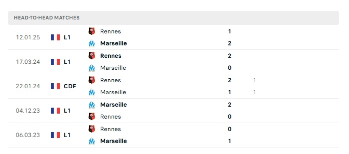 - Kèo tỷ số H2 Marseille vs Rennes: 2-0