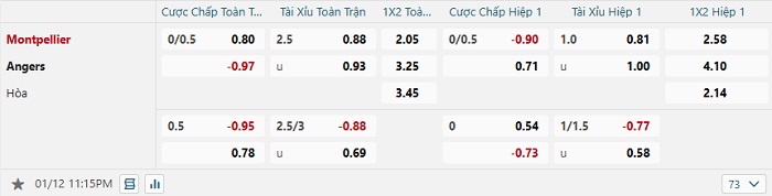 Bảng tỷ lệ kèo bóng đá Montpellier vs Angers