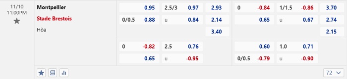 Bảng tỷ lệ kèo bóng đá Montpellier vs Stade Brestois