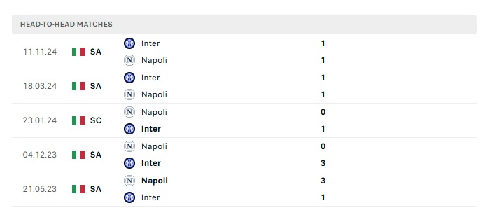 • Kèo tỷ số H2 Napoli vs Inter Milan: 1-1