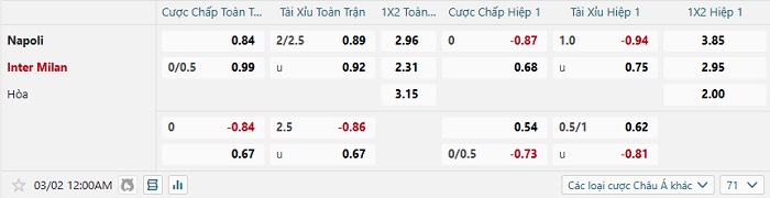 Bảng tỷ lệ kèo bóng đá Napoli vs Inter Milan
