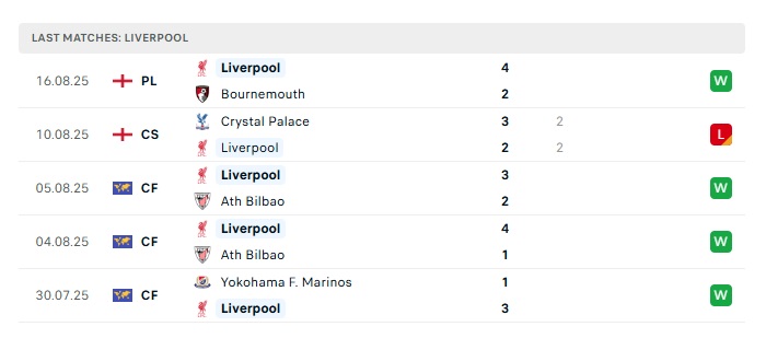 • Phong độ gần đây Liverpool