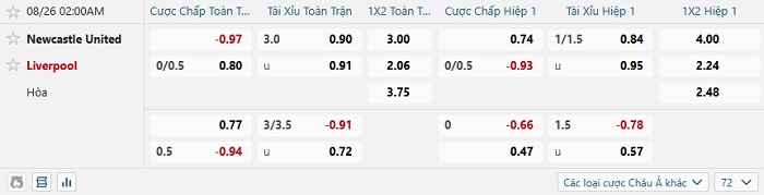 Soi kèo châu Á, kèo Newcastle vs Liverpool