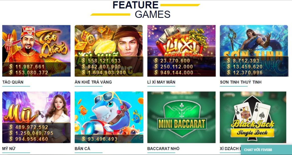 Tại FIVE88 có vô số các trò chơi đẳng cấp với nhiều hình thức cá cược khác nhau phục vụ, đáp ứng nhu cầu của người chơi như poker, number game, hay casino trực tuyến….Tỷ lệ cá cược hấp dẫn, luôn đảm bảo cao hơn so với các nhà cái khác.