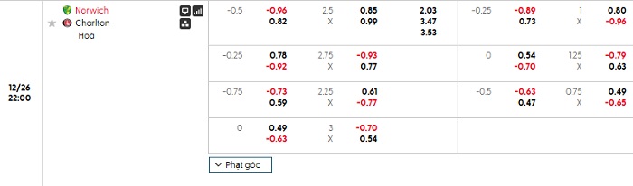 Bảng tỷ lệ kèo bóng đá Norwich vs Charlton Athletic