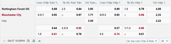 Bảng tỷ lệ kèo nhà cái Nottingham vs Man City