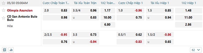 Bảng tỷ lệ kèo nhà cái Olimpia vs San Antonio Bulo Bulo
