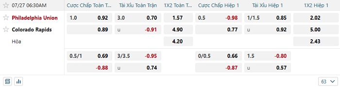 Bảng tỷ lệ kèo bóng đá Philadelphia Union vs Colorado Rapids