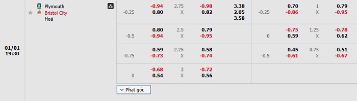- Kèo tỷ số H1 Plymouth Argyle vs Bristol City: 0-1