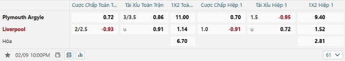 Bảng tỷ lệ kèo bóng đá Plymouth vs Liverpool