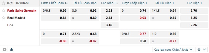 • Kèo tỷ số H2 PSG vs Real Madrid: 1-0