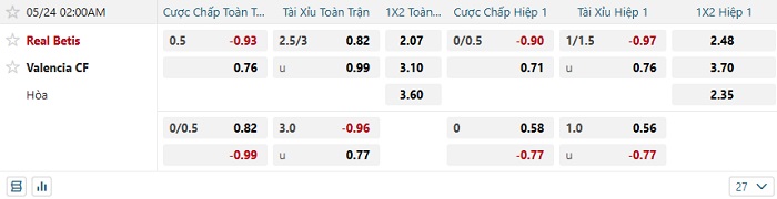 - Kèo tỷ số H1 Real Betis vs Valencia: 0-0