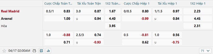 Bảng tỷ lệ kèo bóng đá hôm nay Real Madrid vs Arsenal