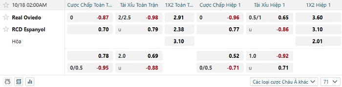 Bảng tỷ lệ kèo bóng đá Real Oviedo vs Espanyol