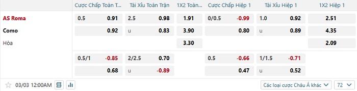 Bảng tỷ lệ kèo bóng đá Roma vs Como