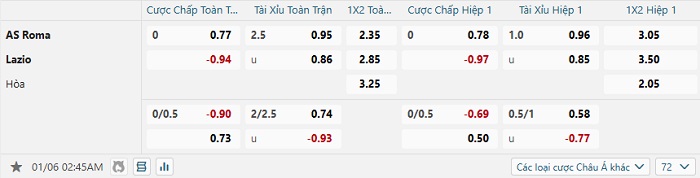 Bảng tỷ lệ kèo bóng đá Roma vs Lazio