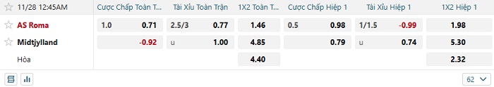 • Kèo tỷ số H2 Roma vs Midtjylland: 1-0