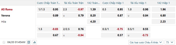 Bảng tỷ lệ kèo nhà cái Roma vs Verona