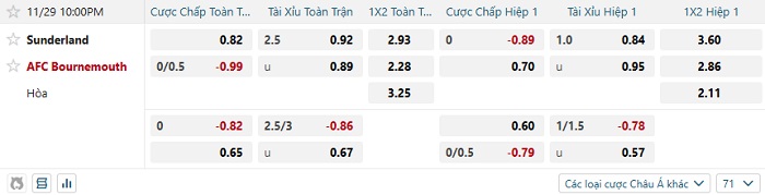Bảng tỷ lệ kèo nhà cái Sunderland vs Bournemouth