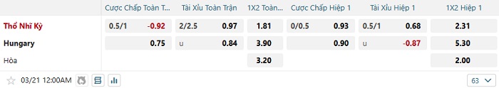 Bảng tỷ lệ kèo bóng đá Thỗ Nhĩ Kỳ vs Hungary