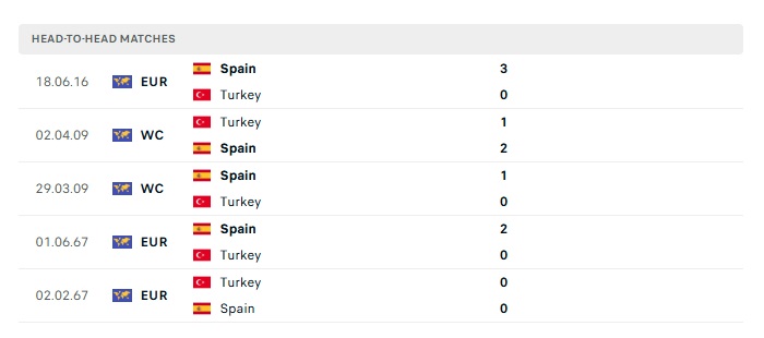 Lịch sử đối đầu Thỗ Nhĩ Kỳ vs Tây Ban Nha