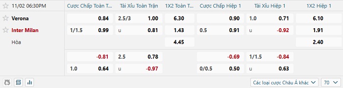 Tip kèo Châu Á hiệp 1 Verona vs Inter