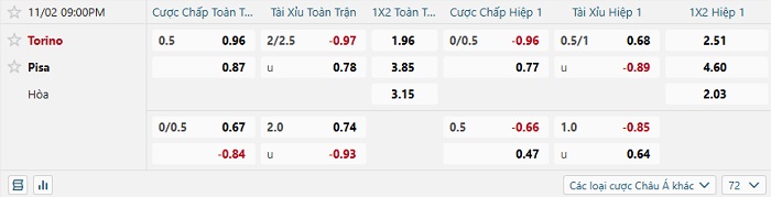 Tip kèo Châu Á hiệp 1 Torino vs Pisa