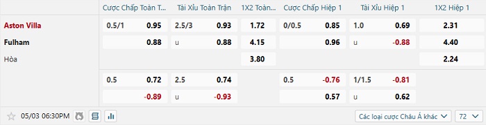 Tip kèo Châu Á full trận Aston Villa vs Fulham