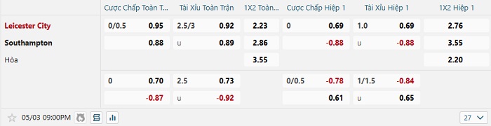 Tip kèo Châu Á hiệp 1 Leicester vs Southampton