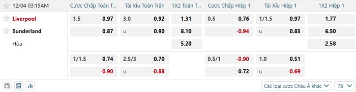 Tip kèo Châu Á full trận Liverpool vs Sunderland