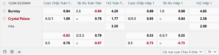 - Dự đoán tỷ số hiệp 1: Burnley 0 – 0 Crystal Palace