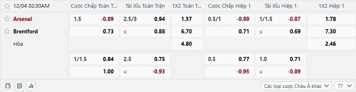 Tip kèo Châu Á full trận Arsenal vs Brentford