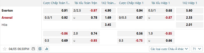 Tip kèo Châu Á hiệp 1 Everton vs Arsenal