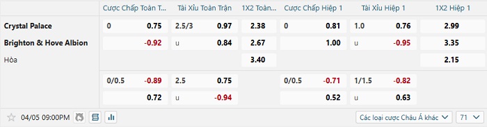 Tip kèo Châu Á hiệp 1 Crystal Palace vs Brighton