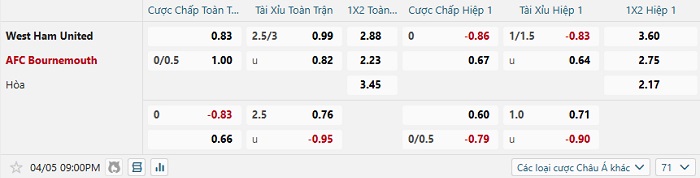 Tip kèo Châu Á full trận West Ham vs Bournemouth