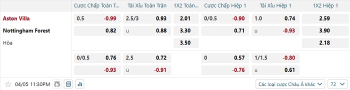 Tip kèo Châu Á hiệp 1 Aston Villa vs Nottingham