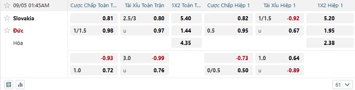 Tip kèo Châu Á full trận Slovakia vs Đức