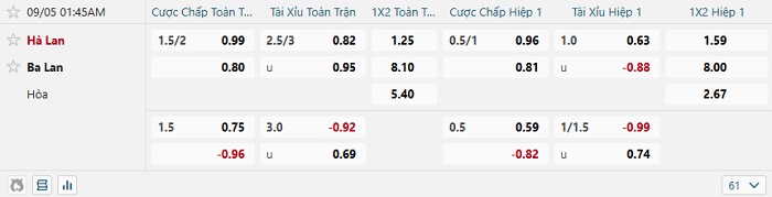 Tip kèo Châu Á hiệp 1 Hà Lan vs Ba Lan