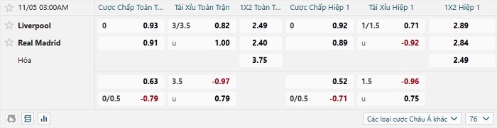 Tip kèo Châu Á hiệp 1 Liverpool vs Real Madrid