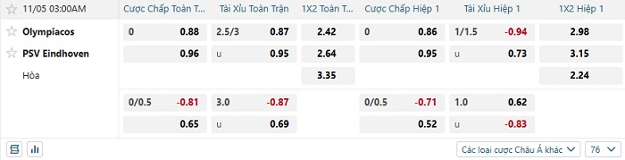 Tip kèo Châu Á full trận Olympiacos vs PSV