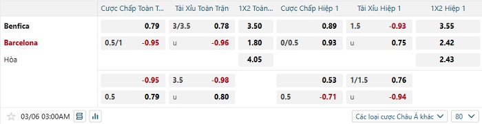 Tip kèo Châu Á hiệp 1 Benfica vs Barcelona