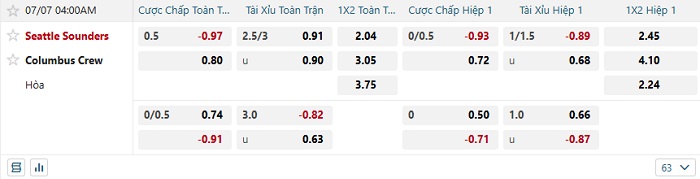 Tip kèo Châu Á full trận Seattle Sounders vs Columbus Crew