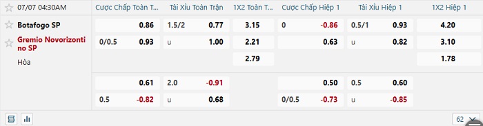Tip kèo Châu Á full trận Botafogo vs Gremio