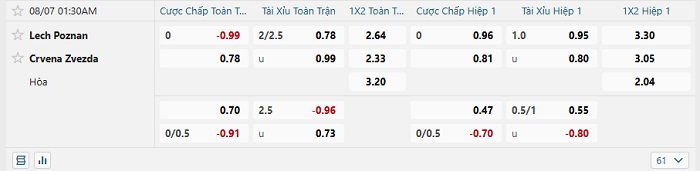 Tip kèo Châu Á full trận Lech Poznan vs Crvena Zvezda