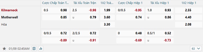 Tip kèo Châu Á full trận Kilmarnock vs Motherwell