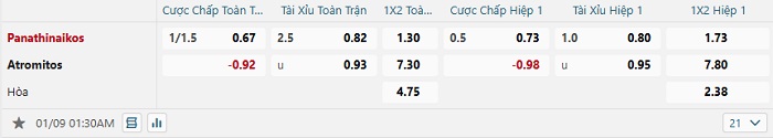 Tip kèo Châu Á hiệp 1 Panathinaikos vs Atromitos