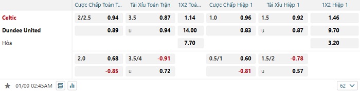 - Dự đoán tỷ số hiệp 1: Celtic 1 – 0 Dundee